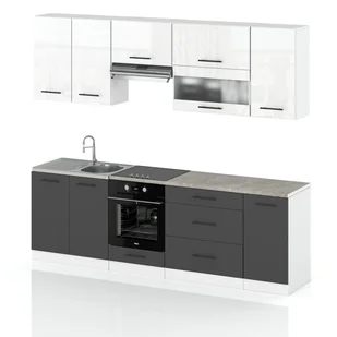 - Zestaw ma szerokość 260 cm, co czyni go odpowiednim zarówno do większych, jak i średniej wielkości kuchni.