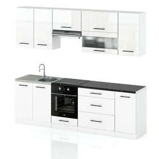 - Zestaw ma szerokość 260 cm, co czyni go odpowiednim zarówno do większych, jak i średniej wielkości kuchni.