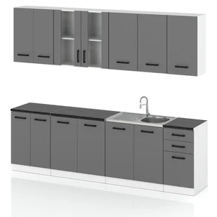 Zestaw Mebli Kuchennych Z Blatem 2.6m Jowita Szary Mat to kompleksowe rozwiązanie, które pozwoli Ci w prost sposób urządzić kuchnię w nowoczesnym stylu. Zestaw składa się z funkcjonalnych i estetycznych szafek w kolorze białego matu i szarego matowego frontu, który doskonale wpasuje się w różne style wnętrz, od skandynawskiego po nowoczesny. Dodatkowo, zestaw jest wyposażony w 180 cm blat, który można dostosować do indywidualnych potrzeb, co czyni go niezwykle praktycznym rozwiązaniem do każdej kuchni. Najważniejsze cechy produktu: