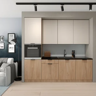 Kuchnia Acari, dzięki swojej uniwersalnej kolorystyce świetnie współgra niemal ze wszystkim, z czym tylko zapragniemy ją zestawić, prosta forma bez zbędnych elementów dekoracyjnych, sprzyja utrzymaniu w nieskazitelnej czystości, wysokie szafki umożliwiające ergonomiczne zagospodarowanie przestrzeni oraz dwa typu wykończenia frontów. Dodatkowo zróżnicowane moduły oraz możliwości wykończenia pozwolą na budowanie dowolnych układów. . -Korpus i fronty z płyty 18 mm - szlachetny i ponadczasowy odcień drewna na korpusie i dolnych frontach - uniwersalna kolorystyka frontów górnych -duży wybór szafek w ofercie uzupełniającej -prowadnice z systemem metalbox - wysokie szafki górne, umożliwiające zagospodarowanie przestrzeni do sufitu - dyskretny podchwyt w szafkach górnych ,ułatwiający czyszczenie
