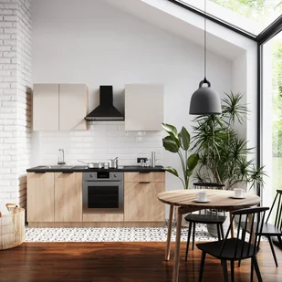 Kuchnia Acari, dzięki swojej uniwersalnej kolorystyce świetnie współgra niemal ze wszystkim, z czym tylko zapragniemy ją zestawić, prosta forma bez zbędnych elementów dekoracyjnych, sprzyja utrzymaniu w nieskazitelnej czystości, wysokie szafki umożliwiające ergonomiczne zagospodarowanie przestrzeni oraz dwa typu wykończenia frontów. Dodatkowo zróżnicowane moduły oraz możliwości wykończenia pozwolą na budowanie dowolnych układów. -Korpus i fronty z płyty 18 mm - szlachetny i ponadczasowy odcień drewna na korpusie i dolnych frontach - uniwersalna kolorystyka frontów górnych -duży wybór szafek w ofercie uzupełniającej -prowadnice z systemem metalbox - wysokie szafki górne, umożliwiające zagospodarowanie przestrzeni do sufitu - dyskretny podchwyt w szafkach górnych ,ułatwiający czyszczenie