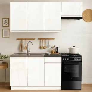 Zestaw MODERN 170 cm biały połysk to gotowa kuchnia do małych wnętrz. Nowoczesny design, przemyślany układ szafek, łatwy montaż i trwała płyta laminowana. Idealny do kawalerek, domków i mieszkań na wynajem. Funkcjonalność bez czekania – gotowy do działania od zaraz.