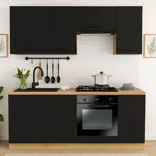 Zestaw kuchenny MODERN 200 cm Czarny to gotowe, stylowe rozwiązanie w loftowym klimacie. Przemyślany układ szafek, pojemne wnętrze, prowadnice Hafele i szybki montaż sprawiają, że sprawdzi się w mieszkaniach, na wynajem i domkach letniskowych.