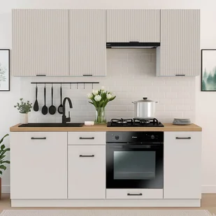 Zestaw MODERN 200 cm w kolorze kaszmir to gotowe rozwiązanie do małych kuchni. Ergonomiczny układ, pojemne szafki, ryflowane fronty i szuflady na prowadnicach Hafele łączą funkcjonalność z nowoczesnym stylem. Idealny do mieszkań, wynajmu i domków letniskowych.