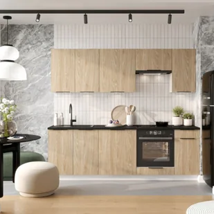 Kuchnia SARA 240 cm Dąb Olejowany – ciepłe, drewniane fronty i czarne detale tworzą stylową, funkcjonalną przestrzeń. Regulowane półki, cichy domyk i możliwość rozbudowy zapewniają wygodę. Idealna do wnętrz nowoczesnych, klasycznych i skandynawskich.