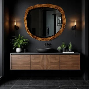 designerskie lustro z drewna naturalnego do łazienki asymetryczne