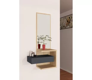 Lustro do montażu na ścianie z półką i szufladą do przechowywania rzeczy, które chcesz mieć zawsze przy sobie, gdy wychodzisz z domu. Dzięki prostemu, nowoczesnemu stylowi pasuje do każdego domu. W kolorze brązowym i antracytowym. Wykonany z laminowanej płyty wiórowej. Grubość materiału: