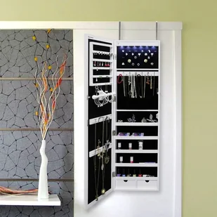 Szafka zamykana na klucz Wewnątrz posiada wiele różnych haczyków, przegródek i schowków Wyścielona aksamitnym materiałem Dodatkowe oświetlenie od wewnątrz Wa...