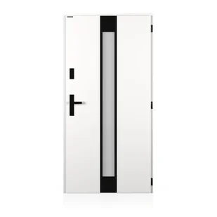 THUNDER to aluminiowo-stalowe drzwi zewnętrzne łączące świetne parametry techniczne z dużymi możliwościami aranżacyjnymi. W standardowym wyposażeniu znajduje się zamek główny wraz z zamkiem dodatkowym, które gwarantują szczelność drzwi i ochronę przed hałasem, chłodem i wiatrem. Jednoskrzydłowe drzwi zewnętrzne THUNDER składają się z ościeżnicy wykonanej z kształtowników aluminiowych trzykomorowych, z przegrodą termiczną o głębokości 50 [mm] oraz skrzydła z grubą przylgą o grubości 62 [mm] wykonanego z blachy stalowej o grubości 0,75 [mm]. Skrzydło drzwi THUNDER o grubości 62 [mm], składa się z dwóch arkuszy blachy stalowej ocynkowanej pomiędzy którymi znajduje się płyta XPS. Skrzydła drzwi są przeszklone szybą wpuszczaną, dwukomorową, typ SILVER (z efektem lustra weneckiego); wykończone od strony zewnętrznej naklejaną aplikacją malowaną w kolorze czarnym.