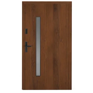 Drzwi zewnętrzne stalowe wejściowe THOR orzechowe 90 lewe to aluminiowo-stalowe drzwi zewnętrzne łączące świetne parametry techniczne z dużymi możliwościami aranżacyjnymi. W standardowym wyposażeniu znajduje się zamek główny wraz z zamkiem dodatkowym, które gwarantują szczelność drzwi i ochronę przed hałasem, chłodem i wiatrem. Jednoskrzydłowe drzwi zewnętrzne THOR składają się z ościeżnicy wykonanej z kształtowników aluminiowych trzykomorowych, z przegrodą termiczną o głębokości 50 [mm] oraz skrzydła z grubą przylgą o grubości 62 [mm] wykonanego z blachy stalowej o grubości 0,75 [mm]. Wypełnienie skrzydła Skrzydło drzwi THOR o grubości 62 [mm], składa się z dwóch arkuszy blachy stalowej ocynkowanej pomiędzy którymi znajduje się płyta XPS. Skrzydła drzwi mogą być przeszklone szybą wpuszczaną, dwukomorową, wykończoną naklejanymi aplikacjami ze stali nierdzewnej lub malowanymi w kolorze czarnym.