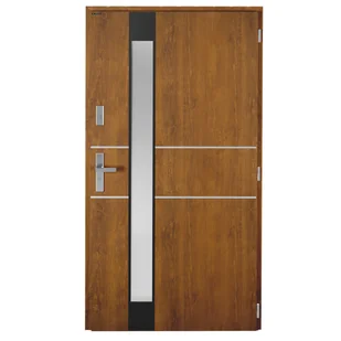 Drzwi wejściowe Titanium 90 prawe złoty dąb to aluminiowo-stalowe drzwi zewnętrzne łączące świetne parametry techniczne z dużymi możliwościami aranżacyjnymi. W standardowym wyposażeniu znajduje się zamek główny wraz z zamkiem dodatkowym, które gwarantują szczelność drzwi i ochronę przed hałasem, chłodem i wiatrem. Jednoskrzydłowe drzwi zewnętrzne TITANIUM składają się z ościeżnicy wykonanej z kształtowników aluminiowych trzykomorowych, z przegrodą termiczną o głębokości 50 [mm] oraz skrzydła z grubą przylgą o grubości 62 [mm] wykonanego z blachy stalowej o grubości 0,75 [mm]. Skrzydło drzwi TITANIUM o grubości 62 [mm], składa się z dwóch arkuszy blachy stalowej ocynkowanej pomiędzy którymi znajduje się płyta XPS. Skrzydło drzwi jest przeszklone szybą wpuszczaną, dwukomorową, typ SILVER (z efektem lustra weneckiego); wykończone od strony zewnętrznej naklejanymi aplikacjami ze stali nierdzewnej lub malowanymi w kolorze czarnym.