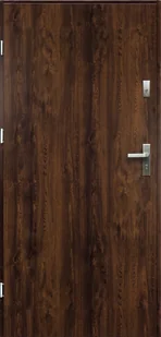 Drzwi wzmocnione otwierane na zewnątrz o grubości 68 mm wykonane z blachy stalowej pokrytej dekoracyjną folią PVC o strukturze i kolorze drewna, odporną na promieniowanie UV. Wypełnienie skrzydła stanowi płyta z polistyrenu spienionego. Skrzydło posiada uszczelki wzdłuż wszystkich czterech krawędzi. W uszczelki wyposażone są również ościeżnice oraz próg. Masywne drzwi, dobre wyciszenie, okucia w zestawie.