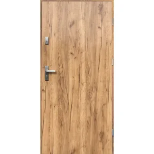Drzwi otwierane na zewnątrz o grubości 55mm wykonane ze stali pokrytej folią dekoracyjną o strukturze drewna, odporną na promieniowanie UV. Wypełnienie drzwi stanowi płyta z polistyrenu spienionego. Drzwi są wyposażone w dwa niezależne zamki trzypunktowe, trzy regulowane zawiasy oraz bolce przeciwwyważeniowe. posiadają również uszczelki w ościeznicy oraz progu. Okucia w zestawie, klamka, szyld , wkładki, bolce antywyważeniowe, uszczelka w ościeznicy, próg niski.