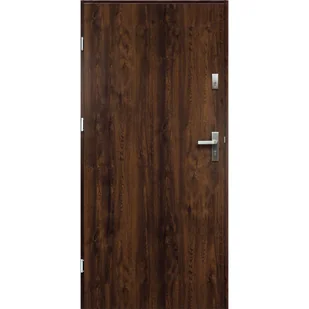 Drzwi otwierane na zewnątrz o grubości 55mm wykonane ze stali pokrytej folią dekoracyjną o strukturze drewna, odporną na promieniowanie UV. Wypełnienie drzwi stanowi płyta z polistyrenu spienionego. Drzwi są wyposażone w dwa niezależne zamki trzypunktowe, trzy regulowane zawiasy oraz bolce przeciwwyważeniowe. posiadają również uszczelki w ościeznicy oraz progu. Okucia w zestawie, klamka, szyld , wkładki, bolce antywyważeniowe, uszczelka w ościeznicy, próg niski.