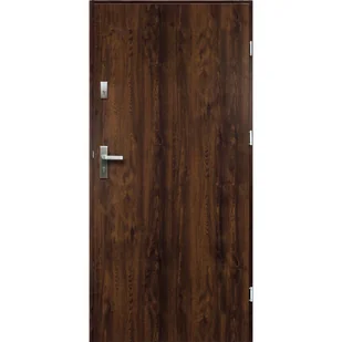 Drzwi otwierane na zewnątrz o grubości 55mm wykonane ze stali pokrytej folią dekoracyjną o strukturze drewna, odporną na promieniowanie UV. Wypełnienie drzwi stanowi płyta z polistyrenu spienionego. Drzwi są wyposażone w dwa niezależne zamki trzypunktowe, trzy regulowane zawiasy oraz bolce przeciwwyważeniowe. posiadają również uszczelki w ościeznicy oraz progu. Okucia w zestawie, klamka, szyld , wkładki, bolce antywyważeniowe, uszczelka w ościeznicy, próg niski.
