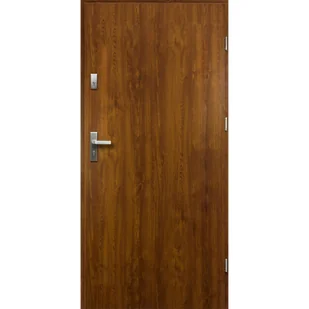 Drzwi otwierane na zewnątrz o grubości 55mm wykonane ze stali pokrytej folią dekoracyjną o strukturze drewna, odporną na promieniowanie UV. Wypełnienie drzwi stanowi płyta z polistyrenu spienionego. Drzwi są wyposażone w dwa niezależne zamki trzypunktowe, trzy regulowane zawiasy oraz bolce przeciwwyważeniowe. posiadają również uszczelki w ościeznicy oraz progu. Okucia w zestawie, klamka, szyld , wkładki, bolce antywyważeniowe, uszczelka w ościeznicy, próg niski.