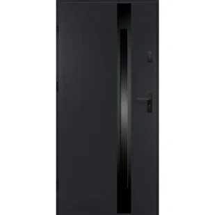 Drzwi stalowe zewnętrzne Adriana V. 3 grubość skrzydła 68 mm szyba shadow ramka wokół szyby black inox kolor drzwi antracytowe drzwi 80 prawe z okuciem, klamką 012 w kolorystyce czarnej. Drzwi Ud 1,3 Wm2K. Wysoka odporność na włamanie: Drzwi stalowe są znacznie trudniejsze do sforsowania niż drzwi drewniane, co zwiększa bezpieczeństwo budynku.