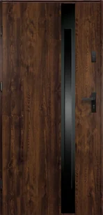 Drzwi stalowe zewnętrzne 90 lewe orzech Adriana V. 3 grubość skrzydła 68 mm szyba shadow ramka wokół szyby black inox kolor drzwi orzech drzwi 90 lewe z okuciem, klamką 012 w kolorystyce czarnej. Drzwi Ud 1,3 Wm2K. Wysoka odporność na włamanie: Drzwi stalowe są znacznie trudniejsze do sforsowania niż drzwi drewniane, co zwiększa bezpieczeństwo budynku.