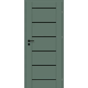 Skrzydło drzwiowe 90 prawe z kolekcji Naos pokojowe wykonane jest w konstrukcji ramowej. Wykończenie powierzchni okleiną dekoracyjną w kolorze oliwki. Charakteryzuje się odpornością na zarysowanie i ścieranie. Skrzydło dedykowane jest do nowoczesnych wnętrz. Skrzydło posiada przeszklenie w formie sześciu poziomych czarnych szyb.