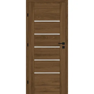 Drzwi wewnętrzne Sangres o solidnej konstrukcji ramowej, pokojowe 70 lewe z podcięciem wentylacyjnym. Skrzydło wyróżnia się nowoczesnym wzornictwem i kolorystyką. Wykończone jest folią 3D z odwzorowaniem wyglądu i struktury drewna, okleina jest odporna na ścieranie. Skrzydło wyposażone jest w pięć wąskich szyb w układzie poziomym. Folia 3D w odcieniu orzech michigan, wpisuje się w najnowszy trend kolorystyczny w architekturze wnętrz.