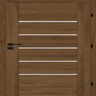 Drzwi wewnętrzne Sangres o solidnej konstrukcji ramowej, pokojowe 80 prawe z podcięciem wentylacyjnym. Skrzydło wyróżnia się nowoczesnym wzornictwem i kolorystyką. Wykończone jest folią 3D z odwzorowaniem wyglądu i struktury drewna, okleina jest odporna na ścieranie. Skrzydło wyposażone jest w pięć wąskich szyb w układzie poziomym. Folia 3D w odcieniu orzech michigan, wpisuje się w najnowszy trend kolorystyczny w architekturze wnętrz.