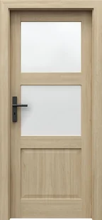 Drzwi wewnętrzne porta balance d. 2 w okleinie dębu matowego łączą naturalny wygląd drewna z funkcjonalnością przeszkleń. Dwa duże przeszklenia wpuszczają światło między pomieszczeniami, tworząc wrażenie przestronności i jasności. Matowa okleina dębu jest trwała i odporna, zachowując elegancki wygląd przez lata. Konstrukcja ramowa z drewna klejonego gwarantuje solidność i stabilność skrzydła drzwiowego.