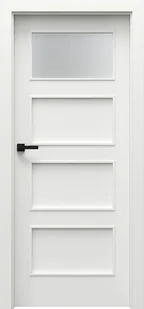 Drzwi wewnętrzne z szybą porta fit h. 1 z białą okleiną wyróżniają się czterema poziomymi przeszkleniami, które wpuszczają naturalne światło między pomieszczeniami. Elegancka biała okleina jest odporna i łatwa w utrzymaniu, idealnie komponując się z każdym wnętrzem. Płytowa konstrukcja z drewnianą ramą gwarantuje solidność i stabilność skrzydła drzwiowego przez lata użytkowania. Przeszklenia w górnej części drzwi optycznie powiększają przestrzeń i rozjaśniają pomieszczenia.