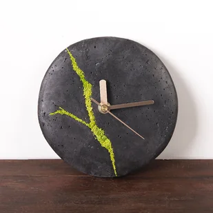 Zegar z betonu architektonicznego z chrobotkiem reniferowym. Zegar ręcznie wykonany z betonu architektonicznego barwionego na kolor ciemnografitowy z chrobotkiem reniferowym umieszczonym w szczelinie ...