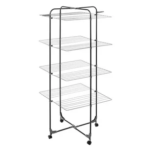 Nowoczesna suszarka piętrowa na ubrania wyposażona w kółka. Suszarka została wykonana z metalu w kolorze czarnym, natomiast uchwyty z tworzywa sztucznego w kolorze szarym. Bardzo praktyczna i uniwersalna, pasująca do każdego wnętrza. Ogromną zaletą jest pojemność suszarki. Powierzchnia suszenia to aż 40 m.