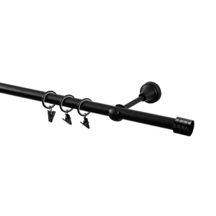 Karnisz Cylinderek 240 cm pojedynczy czarny 19 mm. Nowoczesne wzornictwo karnisza efektownie wygląda z prostymi formami zakończeń. Matowa czerń jest także polecana do kuchni gdyż dobrze wygląda z często występującym na elementach obudowy sprzętu AGD. Karnisz metalowy jest produktem bardzo trwałym, umożliwia zakładanie bardzo ciężkich zasłon. Możliwy montaż do ściany, jak i sufitu.