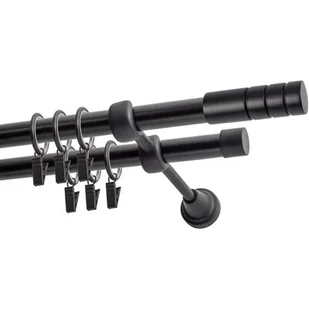 Karnisz podwójny czarny jest bardzo estetycznym produktem, który możesz stosować wewnątrz budynków. To również gotowy zestaw, który obejmuje wszystkie elementy potrzebne do montażu. Oprócz kołków w zestawie znajdziesz również wsporniki, zakończenia, rurkę, a także kółka wraz z żabkami.