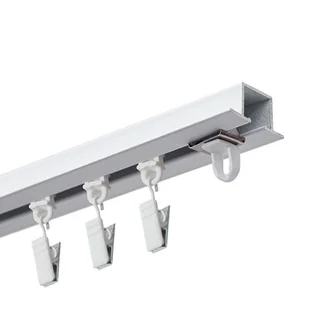 Szyna wyposażona jest w poziome 6 mm półki, których zadaniem jest maskowanie połączenia płyty gipsowej z szyną. Po zamontowaniu szyna wtapia się wizualnie w sufit, a widoczny jest tylko 6 mm kanał ślizgowy, przez który wyprowadzone są ślizgi trzymające tkaninę. Dzięki zastosowaniu takiego rozwiązania uzyskujemy doskonały efekt wizualny tkaniny która prawie dotyka do sufitu, bez żadnych widocznych szyn czy zawiesi. Rozwiązanie doskonale sprawdza się w dzisiejszych modernistycznych wnętrzach cechujących się minimalizmem i funkcjonalnością. Skład zestawu: