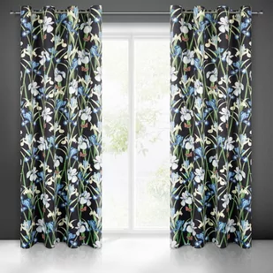 Pięknie wykonana elegancka zasłona MAJA z nadrukiem niebieskich i białych kwiatów na czarnym tle. Zawieszana na przelotki.
