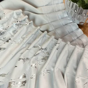 Gotowa welwetowa zasłona ze srebrnym nadrukiem, Marma, na taśmie marszczącej w kolorze pastelowo-szarym, rozmiar 140x250 cm