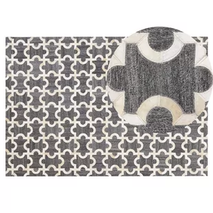Dywan w stylu retro z geometrycznym wzorem Dywan w stylu retro to doskonały dodatek, który sprawi, że każdy salon, sypialnia, czy jadalnia zyska na przytulności. Wykonany z wytrzymałego żakardu w ciemnym, szarym kolorze oraz beżowej skóry bydlęcej idealnie udekoruje każdą przestrzeń. Ozdobiony jest on charakterystycznym wzorem przypominającym puzzle, dzięki któremu wzbogaci twój dom o tradycyjny akcent. Szczegóły: Kolor: Szary, Beżowy. Materiał: Skóra bydlęca.