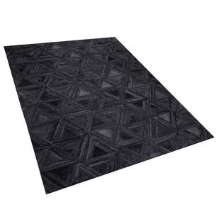 Elegancki dywan ze skóry bydlęcej Prostokątny dywan w klasycznej czerni doda szyku gabinetowi czy pokojowi dziennemu. Produkt został wykonany ręcznie z kawałków skóry bydlęcej w kształcie trójkątów, co daje nietuzinkowy efekt. Skóra została dodatkowo podszyta filcem, dzięki czemu nie będzie rysować powierzchni podłóg. Szczegóły: Kolor: Czarny. Materiał: Skóra bydlęca. Skład materiału: