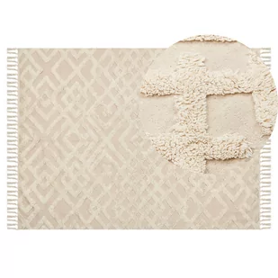 Prostokątny, jasnobeżowy bawełniany dywan z geometrycznym wzorem i frędzlami. Uwielbiasz przytulne przestrzenie, w których możesz poczuć się jak w domu? Dzięki temu teksturowanemu dywanowi z frędzlami każda przestrzeń mieszkalna stanie się o wiele przytulniejsza i jaśniejsza. Naturalne włókna bawełniane sprawiają, że dywan jest niewiarygodnie ciepły i miękki w dotyku. Umieść bawełniany dywanik obok łóżka lub sofy, aby cieszyć się jego wyjątkowym współczynnikiem przytulności i zapewnić swoim gościom odrobinę ciepła. Szczegóły: Rodzaj: Krótkie włosie Styl: