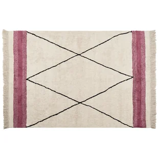 Prostokątny, jasnobeżowy bawełniany dywan z geometrycznymi motywami i frędzlami. Jeśli chcesz uczynić swój dom bardziej przytulnym i stylowym, ten dywan jest idealnym wyborem. Geometryczny, czarny wzór na jasnym tle, dekoracyjne frędzle i szerokie różowe paski sprawiają, że ten dywan z krótkim włosiem jest idealny zarówno do klasycznych, jak i nowoczesnych wnętrz. Miękkie bawełniane włókna gwarantują długotrwałą jakość i przyjemne uczucie pod stopami. Dzięki temu dywan z frędzlami nadaje się szczególnie do wszystkich miejsc, w których lubisz chodzić boso - np.