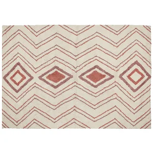 Ręcznie tkany dywan z nowoczesnym wzorem w odcieniach czerwieni i różu. Uzupełnij wygląd swojego salonu lub sypialni dywanem, który rozjaśni całe pomieszczenie. Ten dywan shaggy ma geometryczny wzór w odcieniach różu i czerwieni na beżowym tle w minimalistycznym stylu. Dzięki wysokiej jakości wykonania będziesz cieszyć się tym produktem przez długi czas. Szczegóły: Rodzaj: Krótkie włosie Styl: