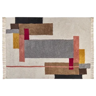 Prostokątny, ręcznie tkany bawełniany dywan z kolorowym, geometrycznym wzorem i frędzlami. Ten beżowy dywan z frędzlami ożywi każdą przestrzeń mieszkalną swoim kolorowym motywem. Wykonany z naturalnej bawełny, jest trwały i przyjemny w dotyku. Oszałamiający, geometryczny wzór i długie frędzle nadają mu modny wygląd. Co więcej, dywan ten jest tkany ręcznie, więc każdy model jest zawsze imponującym unikatem.