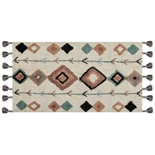 Prostokątny dywan z frędzlami i wzorem w romby. Odśwież swoje mieszkanie przy pomocy tego prostokątnego, ręcznie robionego dywanu, inspirowanego stylem boho. Ten dodatek wykonany został z bawełny, dzięki czemu jest wytrzymały, przyjemny w dotyku, a także łatwy w utrzymaniu - to pozwoli mu ozdabiać twoją sypialnię czy salon przez wiele lat. Na jego froncie umieszczono wielokolorowe romby, a na obydwu końcach ozdobne frędzle, którymi na pewno przyciągnie uwagę. Szczegóły: Typ produktu:
