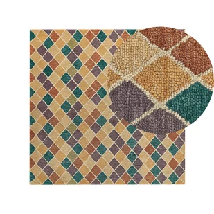 Kolorowy, kwadratowy dywan wełniany z dekoracyjnym wzorem w kratkę. Dywanik z krótkim włosiem jest ręcznie tkany z dbałością o szczegóły z delikatnych włókien wełny, które gwarantują przyjemne doznania sensoryczne dzięki swojej miękkiej fakturze. Żywe kolory nie tylko rozjaśniają każdą przestrzeń mieszkalną, ale także sprawiają, że wygląda ona jaśniej. Ten wysokiej jakości, kolorowy dywan z tkaniny z pewnością wzbogaci każde pomieszczenie o przytulną i komfortową atmosferę. Szczegóły: Rodzaj: Krótkie włosie Styl: