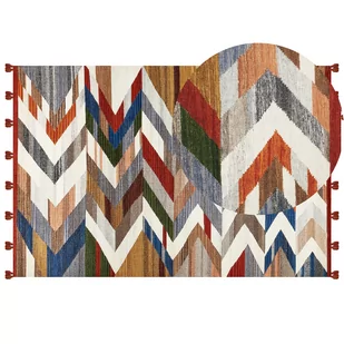 Dzięki temu przyciągającemu uwagę dywanowi twoje mieszkanie zyska zupełnie nowy klimat. Produkt wykonany został ręcznie i posiada kolorowy wzór w jodełkę, co umożliwia dopasowanie dywanu do wielu różnych stylów wnętrzarskich, od boho po retro. Na obu jego końcach umieszczono też dekoracyjne frędzle. Akcesorium utkane zostało z wełny oraz bawełny - dzięki temu jest wytrzymałe, a także przyjemne w dotyku.