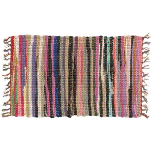 Uniwersalny dywanik z frędzlami CHINDI -wielokolorowy- wpasuje się w każde wnętrze.Łatwo możemy zmieniać jego położenie. Dywaniki w kolorze mix- mogą różnić sięnieznacznie kolorystykyką Z matereiału recyklingowanego.
