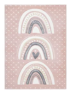 Dziecięcy dywan pastel rainbow to świetna propozycja do pokoju dziewczynki. Jego różowe tło w białe kropki ozdobione jest trzema bajkowymi tęczami. Dywan ma prostokątny kształt o wymiarach 160 x 230 cm. Tkany jest maszynowo i został wykonany z polipropylenu przy użyciu technologii heat set frise. Włos dywanu znakomicie się prezentuje.
