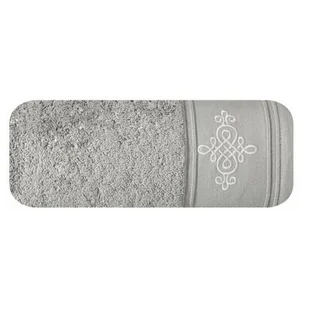 Bawełniany ręcznik w kolorze srebrnym z ornamentowym haftem.