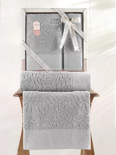 KARNA HOME RĘCZNIK BAWEŁNIANY FROTTE NOVRA GREY 50X90+70X140 - KOMPLET Zestaw dwóch ręczników bawełnianych frotte Novra z pięknym zdobieniem w kwiaty pakowanych do eleganckiego pudełka. Komplet składa się z ręcznika do rąk 50x90 cm oraz do kąpieli 70x140 cm. Komplet ręczników łazienkowych Novra wykonany jest z wysokiej jakości przędz bawełnianych. Odznaczają się wyjątkową miękkością i doskonałą absorpcją wody. Ich wyrafinowany charakter podkreśla wytłaczany wzór i szeroka bordiura z haftem.