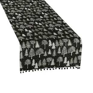 Na krótszych bokach umieszczone są pompony dekoracyjne. Brzeg wykończony jest schludną listwą. Bieżnik posiada nadruk w kolorach bieli oraz srebra. Są to choinki i drzewka świąteczne. Produkt ten to świetna ozdoba salonu a także jadalni.