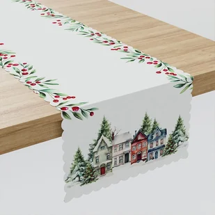 Bieżnik z białej tkaniny wodoodpornej ozdobiony świątecznym nadrukiem, rozmiar 38x160 cm, Zimowe miasteczko