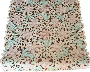 Bieżnik z haftem w kwiaty OH-256-B Kolorystyka: żółto-zielona Skład: 100% poliester Opis: Bieżnik wykonany z tkaniny dekoracyjnej. Zdobiony haftem.